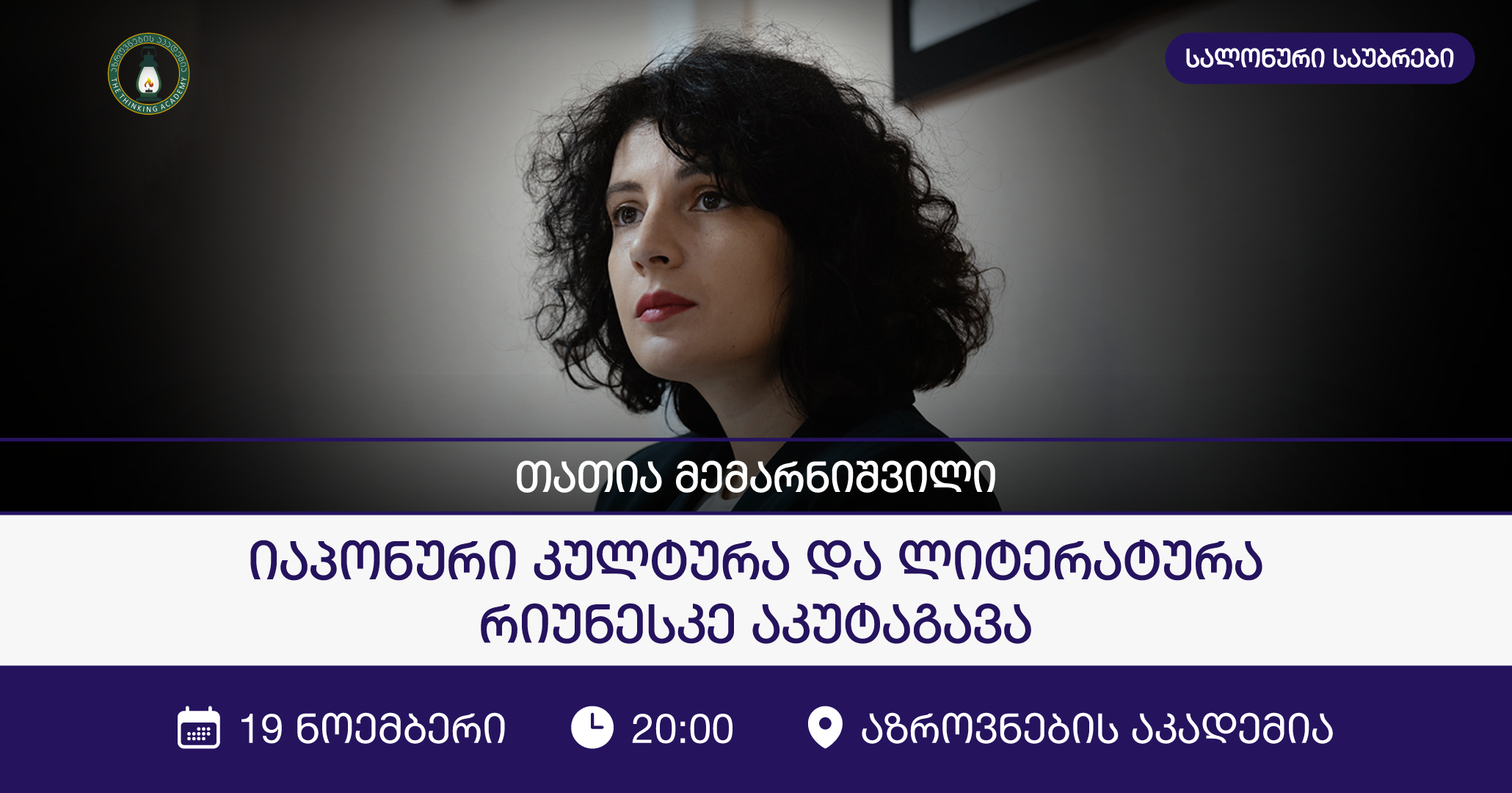 ◼️ აზროვნების აკადემიაში ლექციათა ციკლის, 🔗"სალონური საუბრები ლიტერატურაზე" ფარგლებში გაიმართება სალონური საუბრები თემაზე: "იაპონური კულტურა და ლიტერატურა-რიუნესკე აკუტაგავა". შეხვედრის განმავლობაში თათია მემარნიშვილი ისაუბრებს: