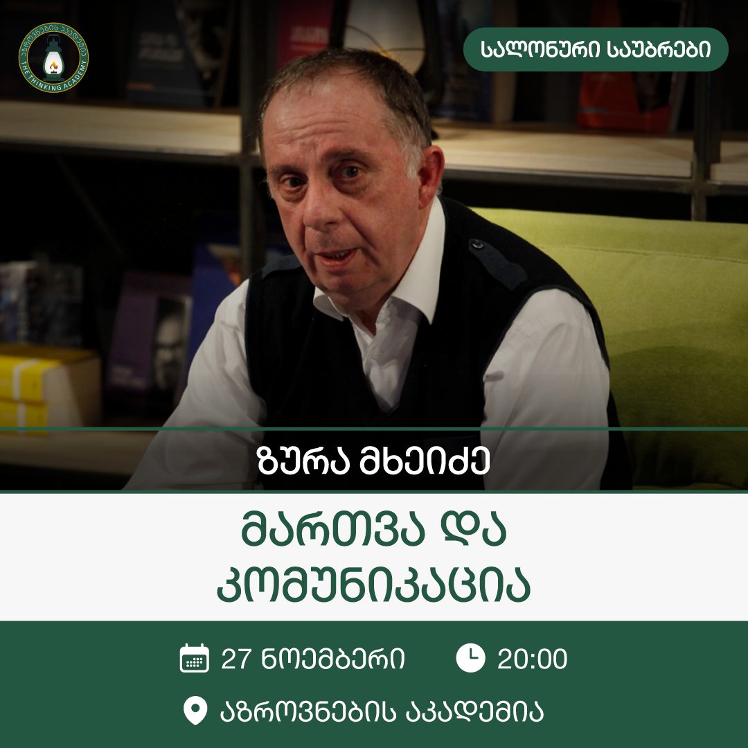 ◼️ აზროვნების აკადემიაში ლექციათა ციკლის, 🔗"ორგანიზაციული კეთილდღეობა:მართვის ფსიქოლოგიუირი ასპექტები"-ს ფარგლებში გაიმართება სალონური საუბრები თემაზე: "მართვა და კომუნიკაცია", რომელსაც ფსიქოლოგი ზურა მხეიძე წარუძღვება.