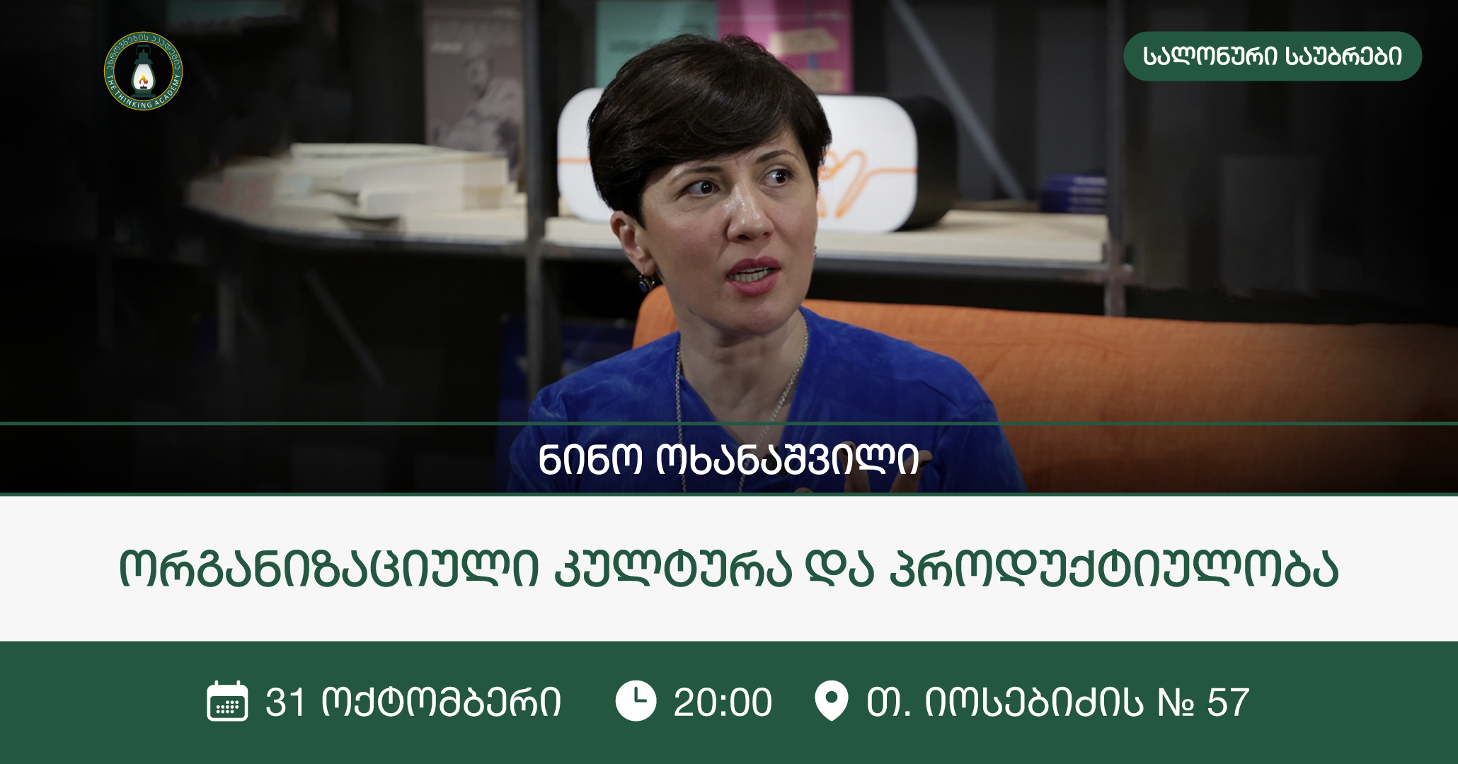 ◼️ აზროვნების აკადემიაში ლექციათა ციკლის, 🔗"ორგანიზაციული კეთილდღეობა:მართვის ფსიქოლოგიუირი ასპექტები"-ს ფარგლებში გაიმართება სალონური საუბრები თემაზე: "ორგანიზაციული კულტურა და კეთილდღეობა", რომელსაც HR და ორგანიზაციული განვითარების კონსულტანტინინო ოხანაშვილი წარუძღვება.