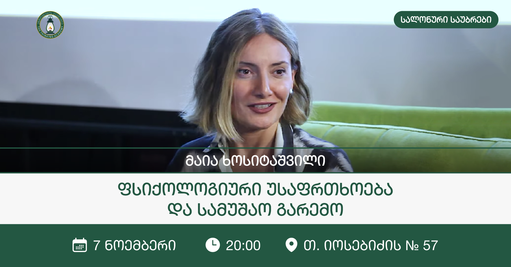 ◼️ აზროვნების აკადემიაში ლექციათა ციკლის, 🔗"ორგანიზაციული კეთილდღეობა: მართვის ფსიქოლოგიური ასპექტები"-ს ფარგლებში გაიმართება სალონური საუბრები თემაზე: "ფსიქოლოგიური უსაფრთხოება და სამუშაო გარემო", მაია ხოსიტაშვილი წარუძღვება.