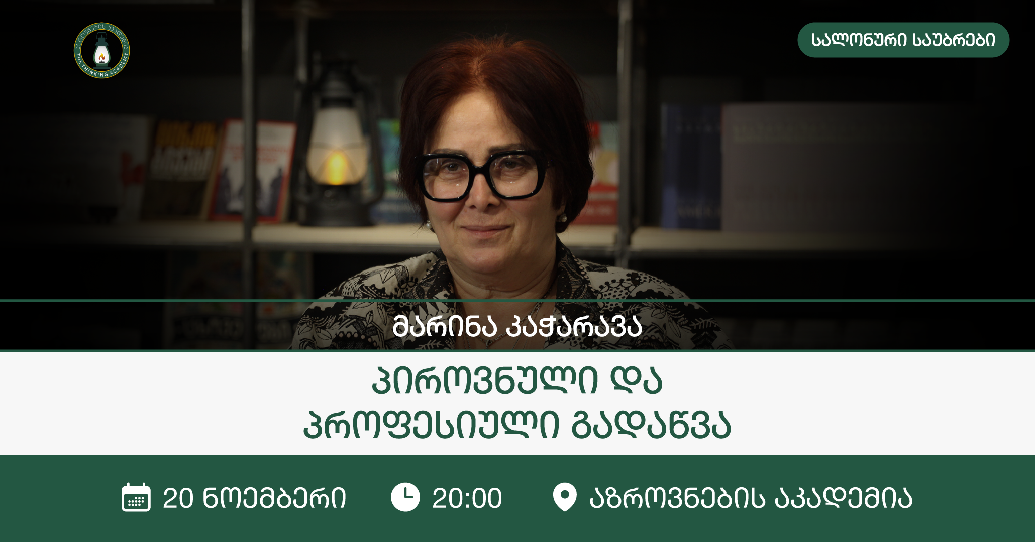 ◼️ აზროვნების აკადემიაში ლექციათა ციკლის, 🔗"პიროვნული განვითარება და ცხოვრების ხარისხი"-ს ფარგლებში გაიმართება სალონური საუბრები თემაზე: "პიროვნული და პროფესიული გადაწვა". შეხვედრის განმავლობაში ფსიქოლოგი მარინა კაჭარავა ისაუბრებს: