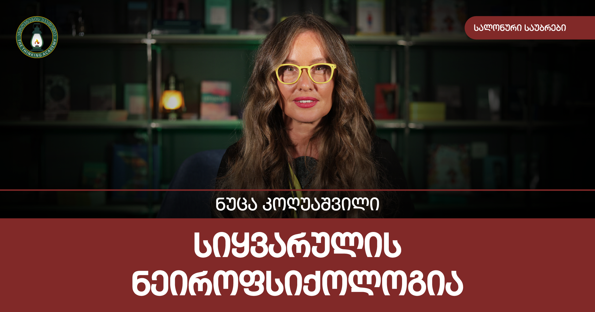 ◼️ აზროვნების აკადემიაში ლექციათა ციკლი - "სიყვარული" ფარგლებში გაიმართება შეხვედრა თემაზე: "სიყვარულის ნეიროფსიქოლოგია", რომელსაც ნეირომეცნიერების მკვლევარი და Youtube არხი-🔗 "Spin"-ის შემქმნელი ნუცა კოღუაშვილი წარუძღვება.