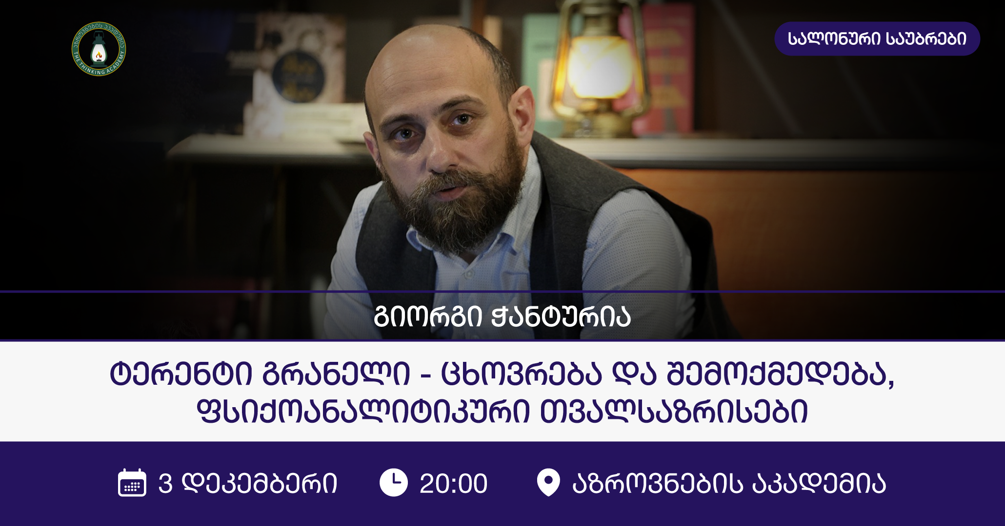 ◼️ აზროვნების აკადემიაში ლექციათა ციკლის, 🔗"სალონური საუბრები ლიტერატურაზე" ფარგლებში გაიმართება სალონური საუბრები თემაზე: "ტერენტი გრანელი-ცხოვრება და შემოქმედება ფსიქოანალიტიკური თვალსაზრისები", რომელსაც აზროვნების აკადემიის მენტალური ჯანმრთელობის ცენტრ, ინტეგრას ფსიქოთერაპევტი, ფსიქოანალიტიკოსი გიორგი ჭანტურია წარუძღვება.