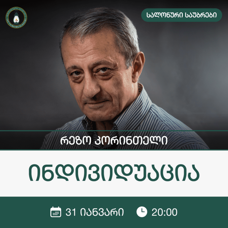 მიმდინარე სალონური საუბრები სწრაფი გადახედვა რეგისტრაცია ბეჭდების მბრძანებელი (ძალაუფლება და მორალი) – ლაშა კილაძე 30 ₾ სწრაფი გადახედვა რეგისტრაცია მარინა კაჭარავას ტრენინგი – მოტივაცია და დისციპლინა 80 ₾ სწრაფი გადახედვა რეგისტრაცია მედეა ტაბატაძის მასტერკლასი- შუა კარიერული კრიზისი – როდის ჩნდება და როგორ ვუპასუხოთ 80 ₾ სწრაფი გადახედვა რეგისტრაცია ალექსი ჩიქოვანის მასტერკლასი- თვითქმნა პერსონალური ბრენდინგი 80 ₾ სწრაფი გადახედვა რეგისტრაცია 50 ₾ სწრაფი გადახედვა რეგისტრაცია ინდივიდუაცია – რეზო კორინთელი 50 ₾ ━━━━━━━━━━━━━━━━━━━━━━━━━━━━━━━━━━━━━━━━━━━━━━━━ჩატარებული სალონური საუბრები სწრაფი გადახედვა რეგისტრაცია პიროვნული და პროფესიული გადაწვა-მარინა კაჭარავა 80 ₾ სწრაფი გადახედვა ვრცლად მედიტაცია, როგორც თერაპია – სოსო დოლიძე სწრაფი გადახედვა რეგისტრაცია მენტალური ჯანმრთელობა და ორგანიზაციული კეთილდღეობა- ანა ღვინიანიძე 50 ₾ სწრაფი გადახედვა რეგისტრაცია ესპანურ-ქართული ამბები- დათო ტურაშვილი 30 ₾ სწრაფი გადახედვა რეგისტრაცია რუმი და სუფიზმის კონტურები – ანდრო დგებუაძე 50 ₾ სწრაფი გადახედვა რეგისტრაცია უილიამ ფოლკნერი- აგვისტოს ნათელი -ზაალ ჩხეიძე 50 ₾ სწრაფი გადახედვა რეგისტრაცია მოტივაცია და თვითშეფასება – ნინო ბუაძე 30 ₾ სწრაფი გადახედვა რეგისტრაცია აღზრდის ოქროს წესი- ზურაბ ვახანია 30 ₾ სწრაფი გადახედვა რეგისტრაცია შფოთვისა და სტრესის მართვა – ოლიკო ნაკაშიძე 30 ₾ სწრაფი გადახედვა რეგისტრაცია მადლიერება და პოზიტიური აღზრდა – მარინა კაჭარავა 50 ₾ სწრაფი გადახედვა რეგისტრაცია აღზრდის თანამედროვე გამოწვევები (ციფრული მედია, დიდი ქალაქები, თაობათაშორისი განსხვავებები) 30 ₾ სწრაფი გადახედვა რეგისტრაცია ჯემალ ქარჩხაძე-ზებულონი- ანა ქირია 30 ₾ სწრაფი გადახედვა რეგისტრაცია იაპონური კულტურა და ლიტერატურა – რიუნოსკე აკუტაგავა – თათია მემარნიშვილი 30 ₾ სწრაფი გადახედვა ვრცლად სიყვარული და ურთიერთობები – ნათია გოცაძე სწრაფი გადახედვა ვრცლად „რამაც აქამდე მოგიყვანა, შორს ვეღარ წაგიყვანს- ალექსანდრე ჯეჯელავა“ სწრაფი გადახედვა რეგისტრაცია სინქრონიზმი-რეზო კორინთელი 50 ₾ სწრაფი გადახედვა რეგისტრაცია გავლენები და ურთიერთობები- ზურა მხეიძე 80 ₾ სწრაფი გადახედვა რეგისტრაცია ტერენტი გრანელი – ცხოვრება და შემოქმედება, ფსიქოანალიტიკური თვლასაზრისები – გიორგი ჭანტურია 30 ₾ სწრაფი გადახედვა რეგისტრაცია არაცნობიერი-რეზო კორინთელი 50 ₾ სწრაფი გადახედვა რეგისტრაცია ფიქრი გრძნობა და მოქმედება- ანდრო დგებუაძე 80 ₾ სწრაფი გა